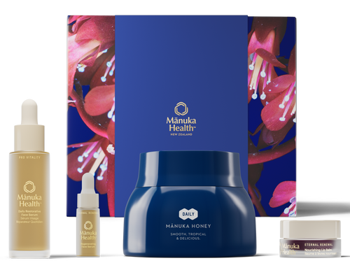 For a gift set that embodies our complete, harmonious approach to wellness, look no further than the Daily Essentials Kit. This luxurious collection features treasures from Mānuka Health’s LIFE, IMMUNITY, and IMMORTALITY ranges. Included are Daily MGO 400+ Mānuka Honey, the Pro Vitality Daily Restorative Face Serum, Eternal Renewal Nourishing Lip Balm, and the Eternal Renewal Mini Regenerating Face Serum. With the combined power of mānuka honey, propolis, and royal jelly, the Daily Essentials Kit offers a taste of the full spectrum of the honeybee and mānuka tree’s golden gifts—boosting vitality, enhancing resilience, and inspiring a radiant glow from within.