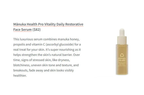 Our Pro Vitality Daily Restorative Face Serum is featured in NewBeauty as a must-try formula showcasing the power of propolis. This luxurious serum combines mānuka honey, propolis, and vitamin C (ascorbyl glucoside) to deeply nourish and strengthen the skin’s natural barrier. With continued use, it helps reduce visible signs of stressed skin such as dryness, blotchiness, uneven tone and texture, and breakouts, leaving skin looking healthier and more radiant.